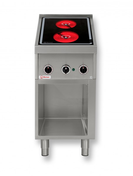 Bei den Speedstar-Geräten aus dem Hause Berner handelt es sich um besonders schnell aufheizende Ceran-Kochtechnik mit elektronischer Leistungsregelung über Potentiometer und nicht wie bei den meisten Glaskeramikkochfeldern über thermostatische Stufenschalter. Der Berner BSH2KTDA ist ein 2-flammiger Ceranherd mit offenem Unterbau für kleinere und mittlere Gastronomie- und Gewerbeküchen, die bei Qualität und Zuverlässigkeit keine Kompromisse eingehen wollen. Kochtechnik Made in Germany. By Berner Induktion...